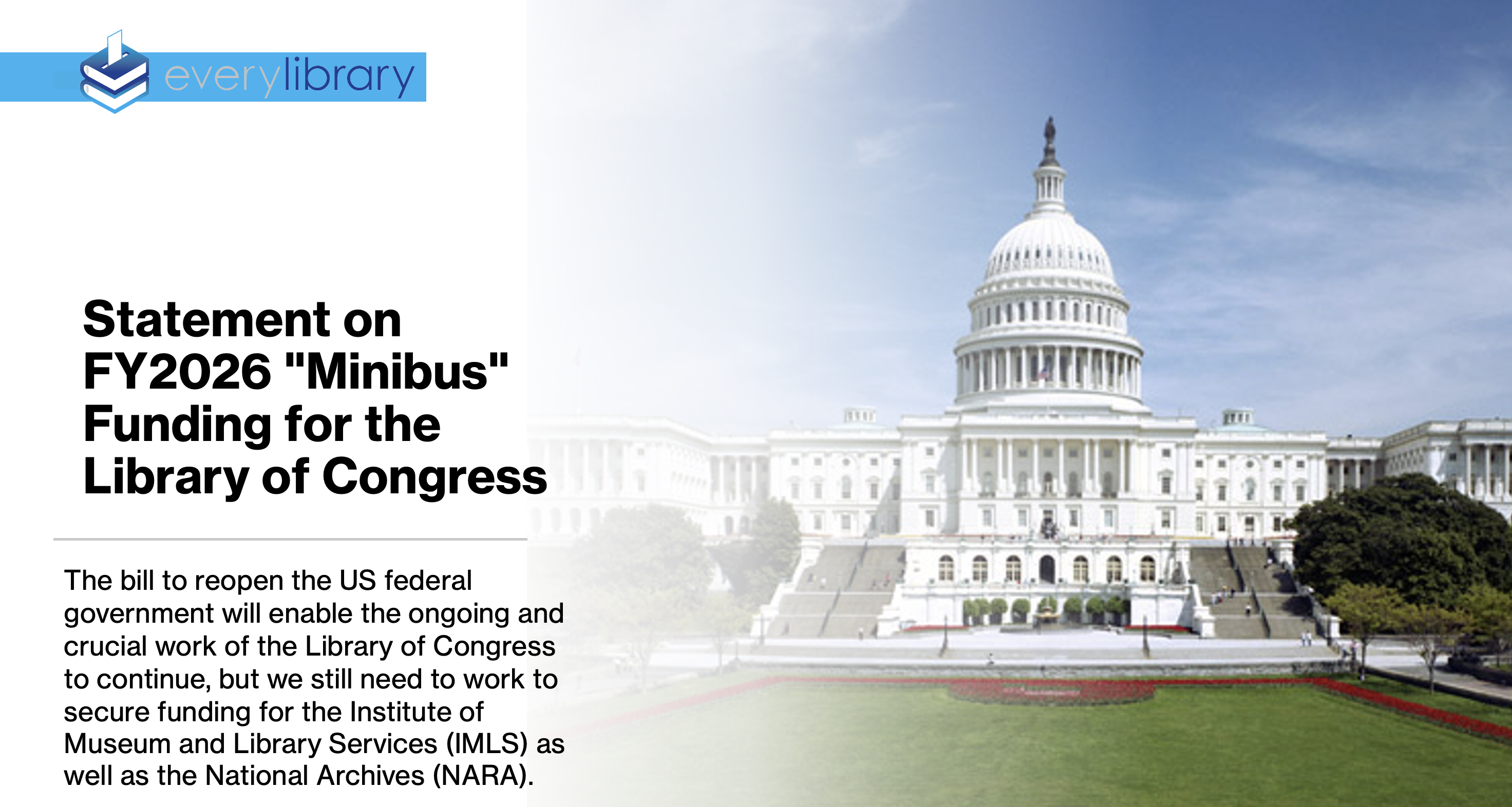 "While the Library of Congress FY2026 budget is set, full-year funding for the Institute of Museum and Library Services (IMLS) and the National Archives (NARA) remains tied to the Continuing Resolution and ongoing budget fights," said John Chrastka, Executive Director of EveryLibrary. "State libraries, museums, and grant recipients rely on IMLS to strengthen local institutions and improve services for the people they serve. The NARA must be properly funded, both for its core responsibilities and for its crucial role in preparations for the nation’s 250th anniversary. This is a critical time for library advocates to engage with members of Congress, as well as state legislatures and governors, regarding the federal-state funding framework that supports library services nationwide."