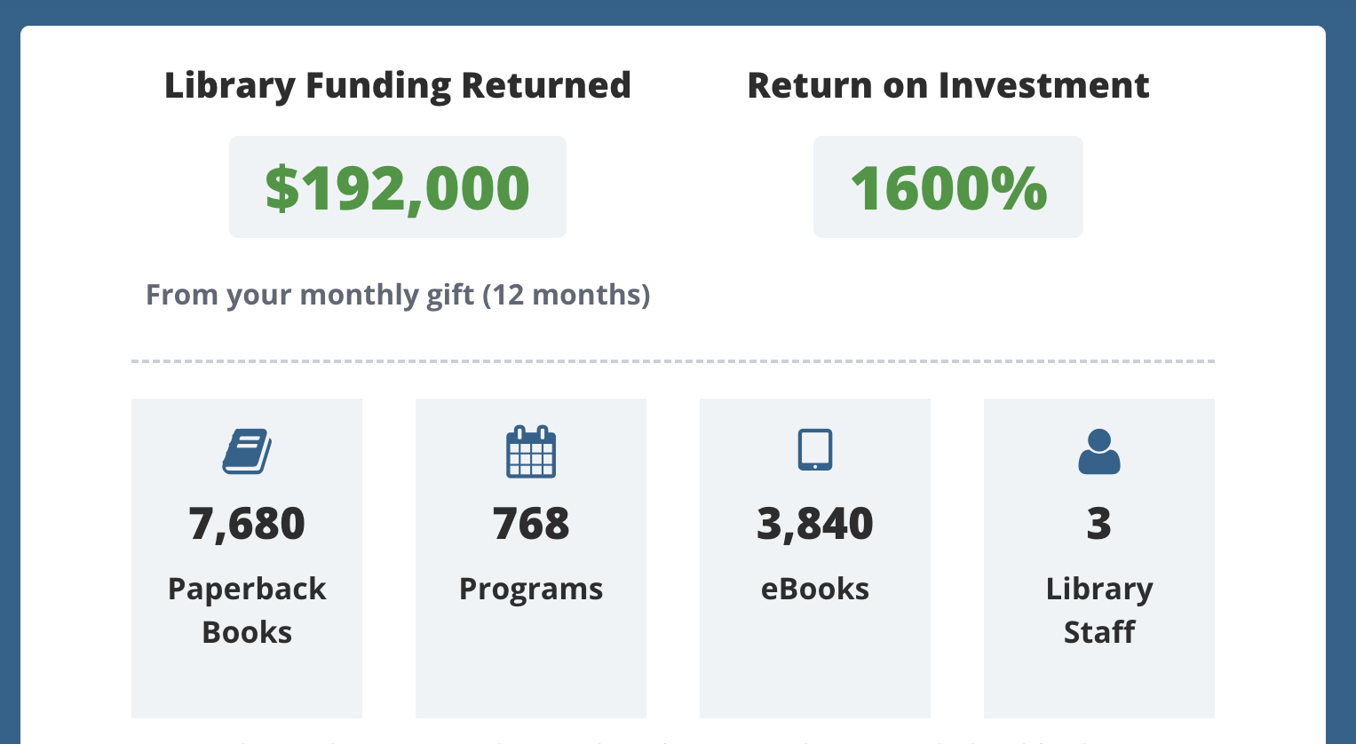 Enter any amount: $10, $50, $100. Watch it translate into books, programs, eBooks, and librarian staff positions that your gift helps communities secure.