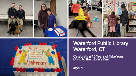 “We couldn’t be prouder that our library is the birthplace of Take Your Child to the Library Day, launched 15 years ago! This celebration invites families to explore their public library, a welcoming and free community resource that supports early literacy and provides engaging programs for all,” said Jenna Bivona of Waterford Public Library of Waterford, CT. “To mark the 15th anniversary, our festivities included a concert with local children’s musician Steve Elci (who performed at the very first Take Your Child to the Library Day), therapy dogs, as well as literary-themed crafts and activities. To kick off the day, we honored former Children’s Librarian Nadine Lipman, who played an integral part in making this special event a reality. Despite the less-than-ideal weather, the library was filled with families spending quality time together, which is exactly what makes this day so meaningful.”
